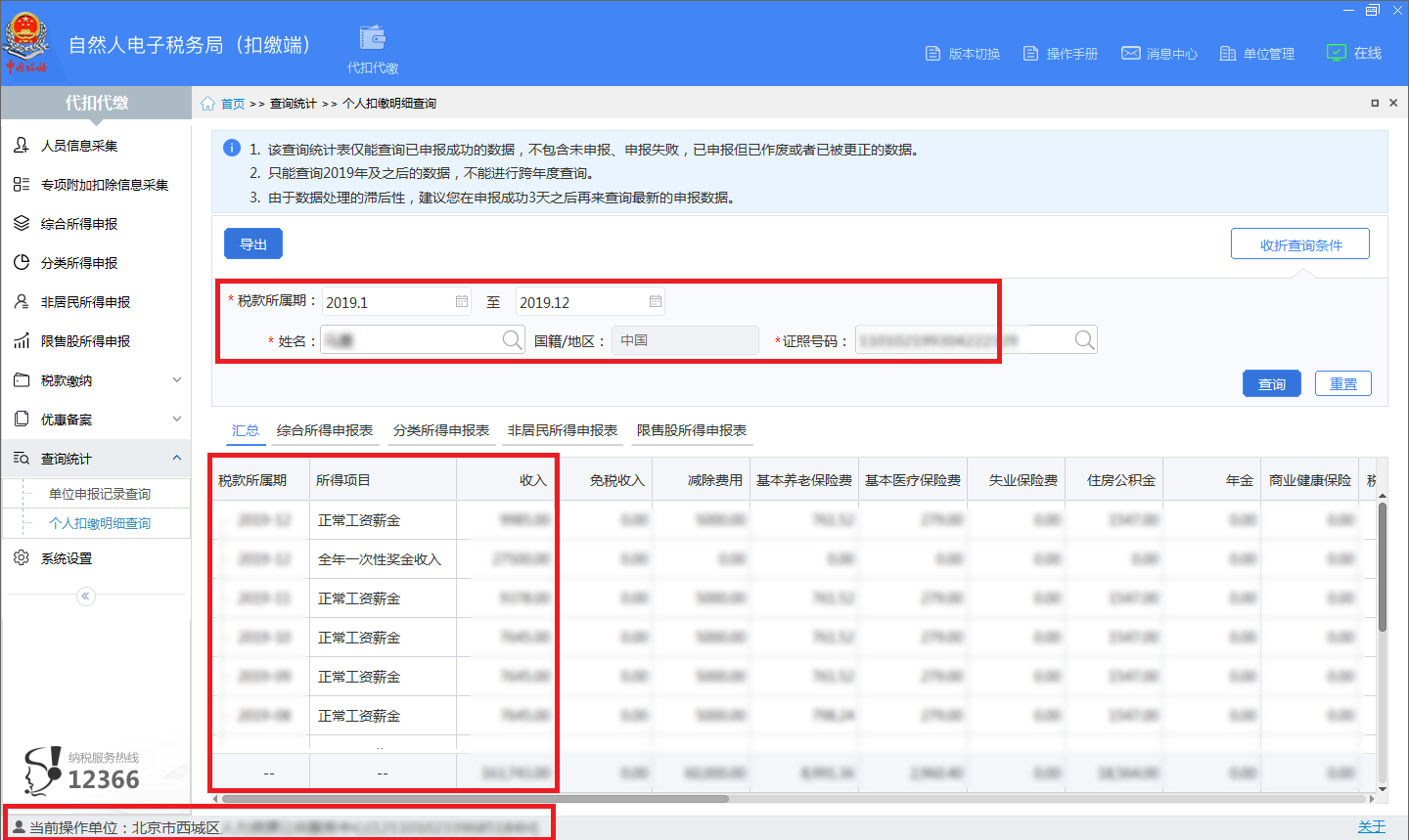 (2)2019年后報稅截屏。單位登錄“自然人稅收管理系統(tǒng)”,在代扣代繳項目欄的查詢統(tǒng)計功能中點擊個人扣繳明細查詢(樣例參見附件4 ,須包含樣例圖示紅框內容)”